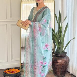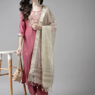 Myx Women’s Embroidered Cotton Kurta Pant Set with Organza Dupatta