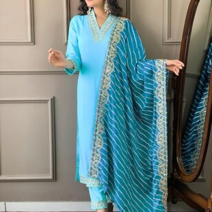 Naixa Women’s Rayon Embroidered Straight Kurta with Pant and Dupatta Sets